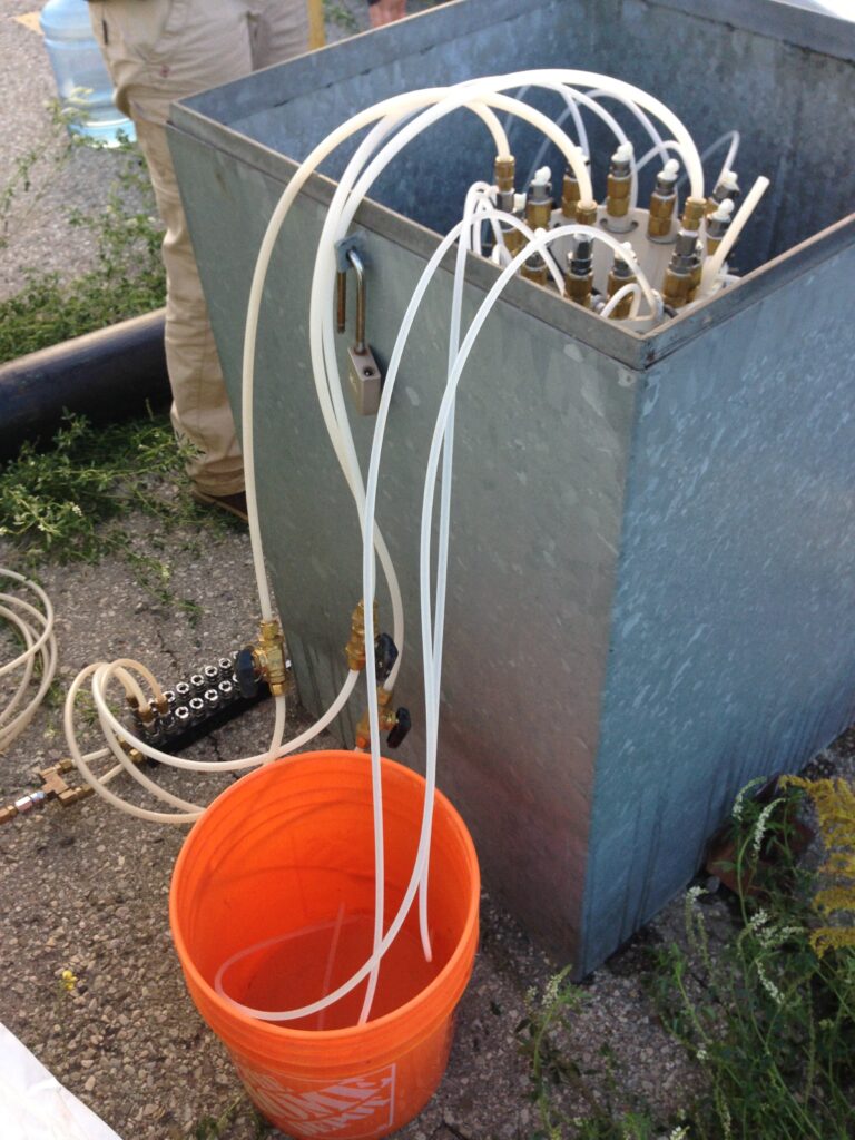 Sur les photos ci-dessous, on peut voir la chercheuse Violaine Ponsin sur le terrain, à côté d’un puits d’échantillonnage d’eau souterraine multi-niveaux dans un aquifère rocheux fracturé. Ce genre de puits permet d’échantillonner l’eau à plusieurs profondeurs et dans des nappes différentes. On voit également une sonde multi-paramètres qui enregistre les données pH, température, oxygène dissous dans l’eau souterraine échantillonnée en temps réel.